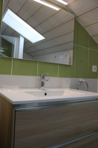 Spacieuse avec douche fermée (120 x 90) 2 lavabos sur meuble 4 tiroirs, sèche serviettes et table à langer.