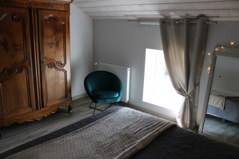 2eme chambre : Spacieuse, avec un lit de 160 dans son alcove bleu nuit, deux chevets et lampes patinés en noir, elle vous invitera au repos. Elle est équipée aussi d'un grand miroir, d'un fauteuil et une armoire charentaise.